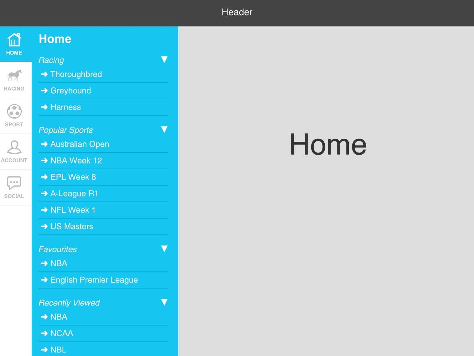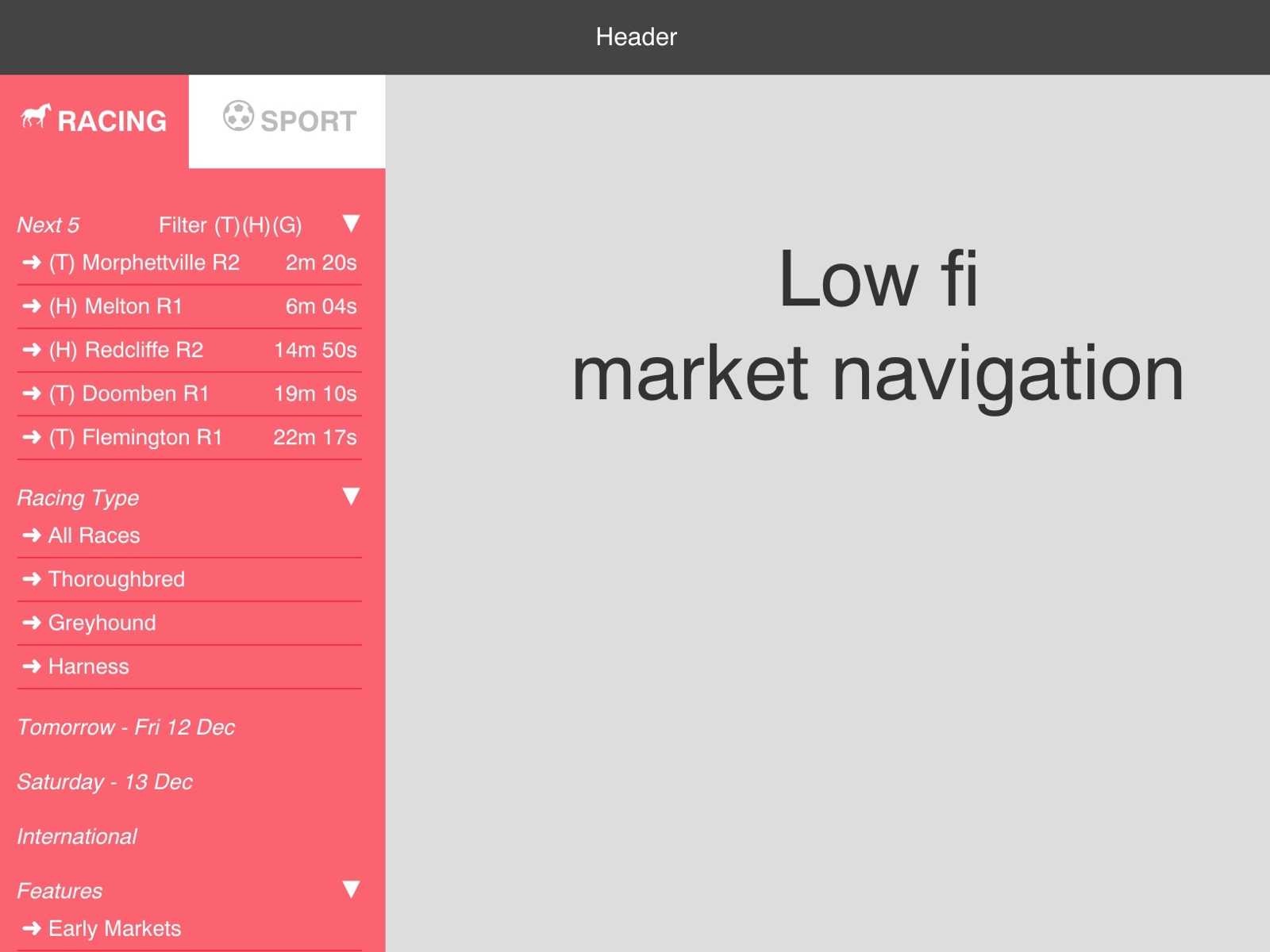 The feedback was that the tab design had merit but perhaps not enough of the key racing information was immediately available to the user. It was also suggested that it was straying too far from what users were familiar with. Racing bets still account for the majority of revenue in Australia. We decided we should streamline it. We ended up deciding on a racing and sports tab and moved the social and account information into a secondary menu.