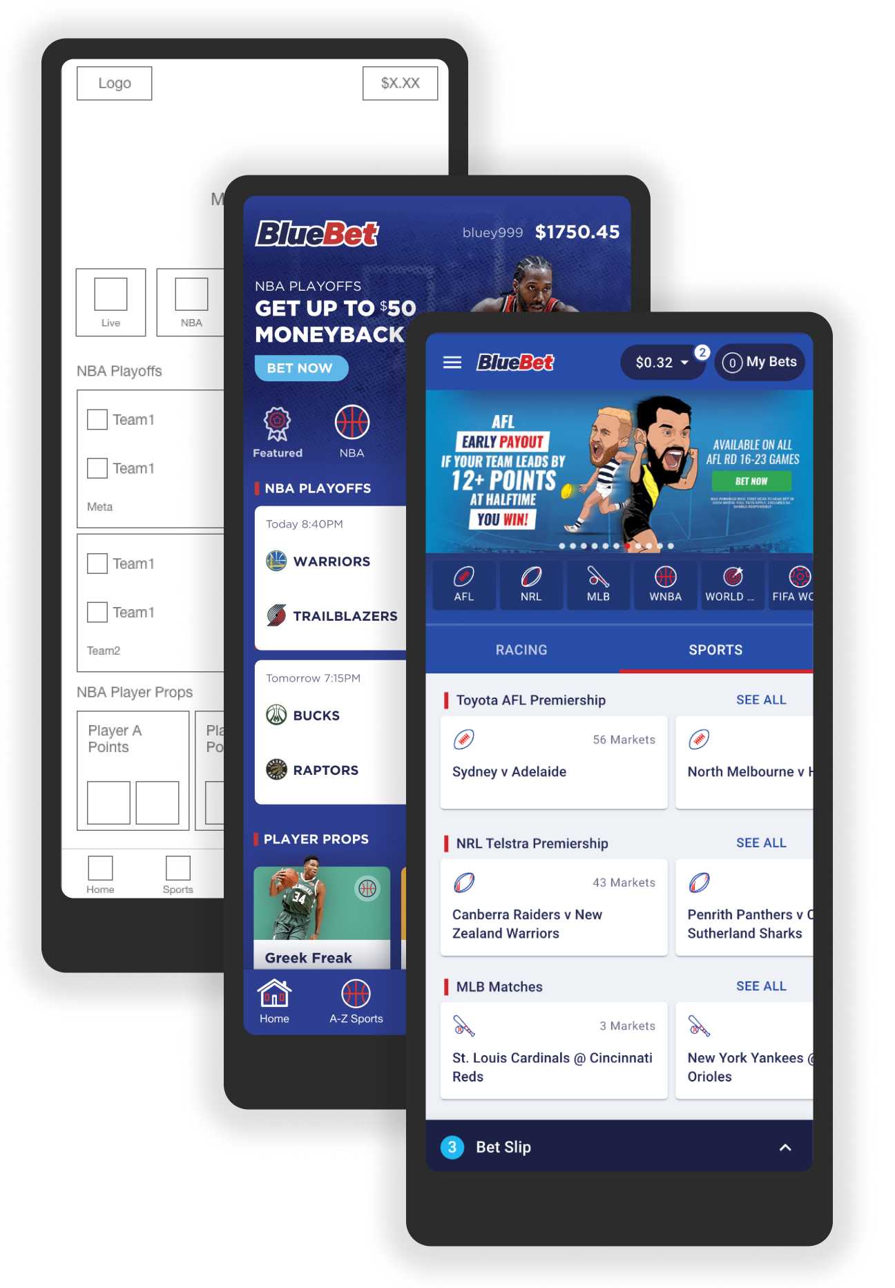 Thanks to everyone from Bluebet, Stride Solutions and Artisan Digital. The project delivered on time and budget. It was great to be part of a redesign of a product. It was especially cathartic to redesign my own work and address issues from the original. Mentoring a junior designer throughout the process was especially rewarding.